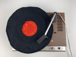 made out of a vintage hoodie turned inside out, crocheted letters and a fuzzy world